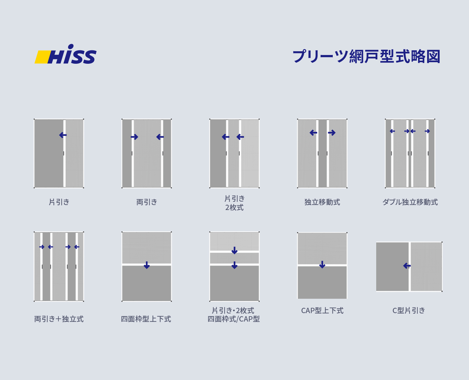 清展が提供する摺りたたみ式網戸/網戸ドアは、以下の10種類の形式で製作可能です。