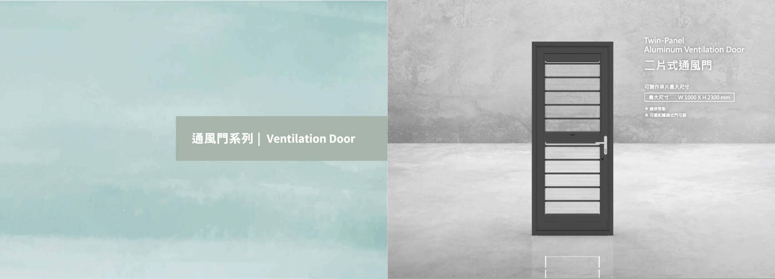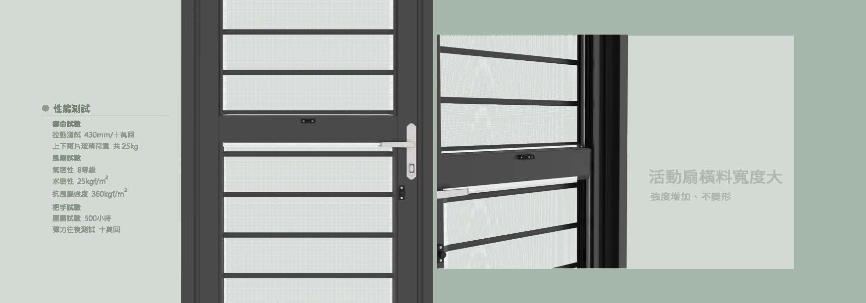 不僅外型美觀,尚兼具通風、防蚊與防盜功能。 該產品設計利用室內外氣壓、溫差形成對流,在關門的狀況下,還能保持通風,同時保有防盜功能,通風量可高達整扇門總面積的1/2。 U型鋼索傳動方式能降低開啟力與噪音,增長產品使用年限。內框結構採崁合式設計,結構堅固、不易變形。